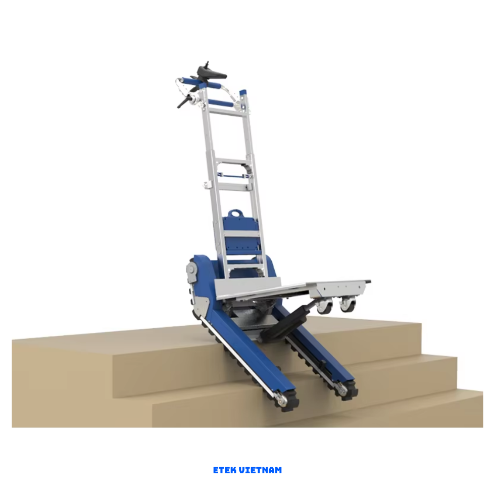 Các thông số quan trọng gồm công suất động cơ 0.75–1.5 kW, điện áp 220 V, tốc độ leo trung bình 6–10 m/phút. Khung thép chịu lực và bề mặt chống trượt giúp xe vận hành ổn định trên cầu thang bê tông hoặc thép.