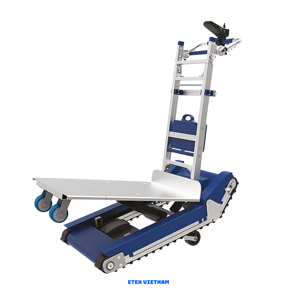 xe vận chuyển leo cầu thang chung cư sử dụng hệ thống bánh xích hoặc bánh sao 3 trục xoay liên tục. Động cơ điện công suất 1.2 đến 2.5 kW, pin lithium 48V cho thời gian hoạt động 6 đến 8 giờ. Cảm biến tải trọng giúp phân bổ lực đều trên từng bậc thang.
